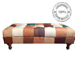 Banqueta Multicolor de cuero, patas de madera, relleno con espuma de alta densidad.