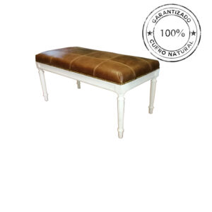 Banqueta con tapiz de cuero u estructura de madera, pies de madera pintada blanca.
