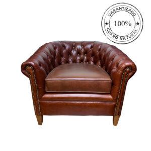 Sillón fabricado íntegramente en cuero, respaldo en capitoné y asiento con cojines.