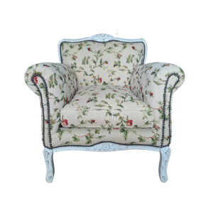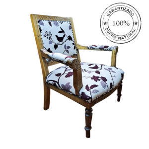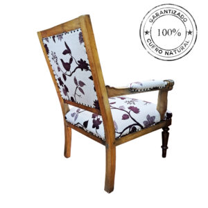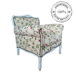 Sillón tapizado en tela con estructura de madera nativa, tratamiento envejecido. Tapiz frances victoriano floreado blanco y crema, patas de madera.