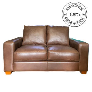 Sofá fabricado íntegramente en cuero, respaldo liso y asiento con cojines.