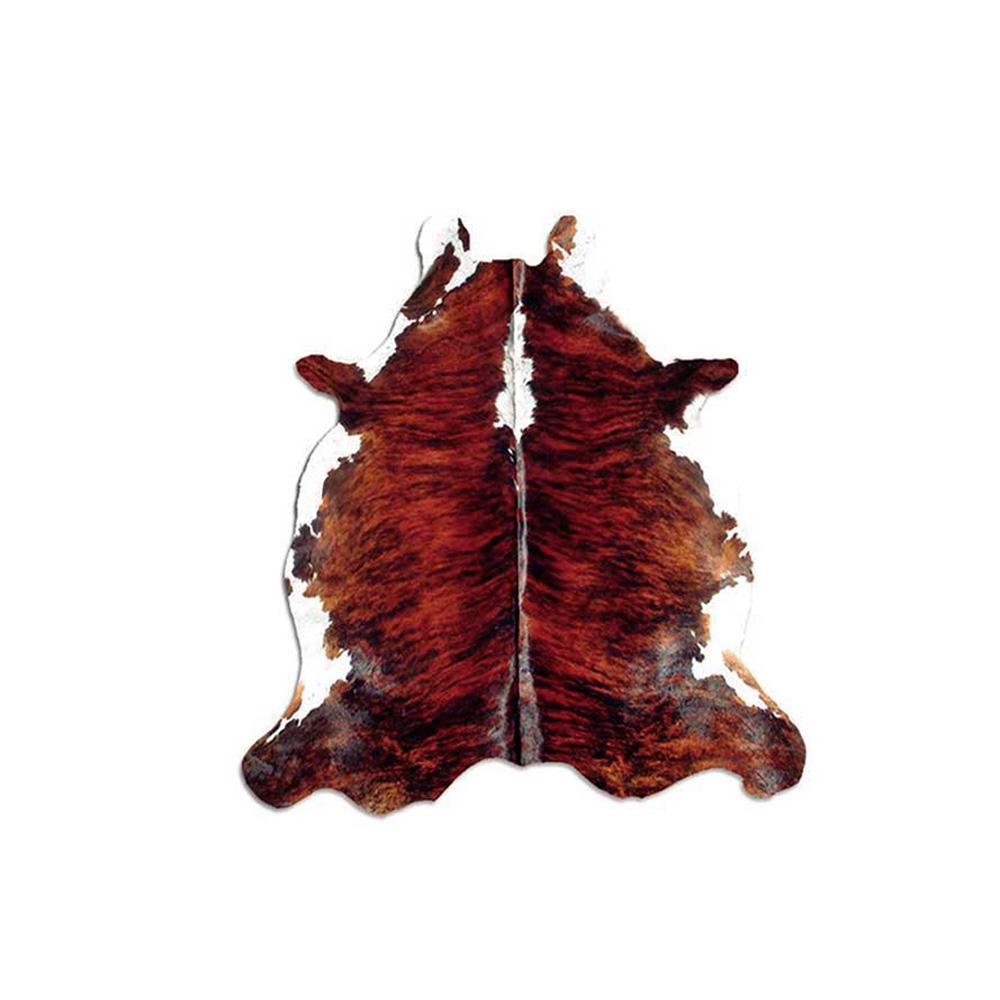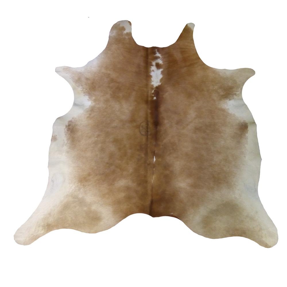 Alfombra de piel con diseño natural liso de color café con manchas blancas.