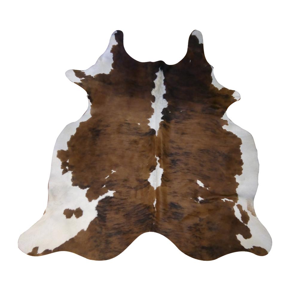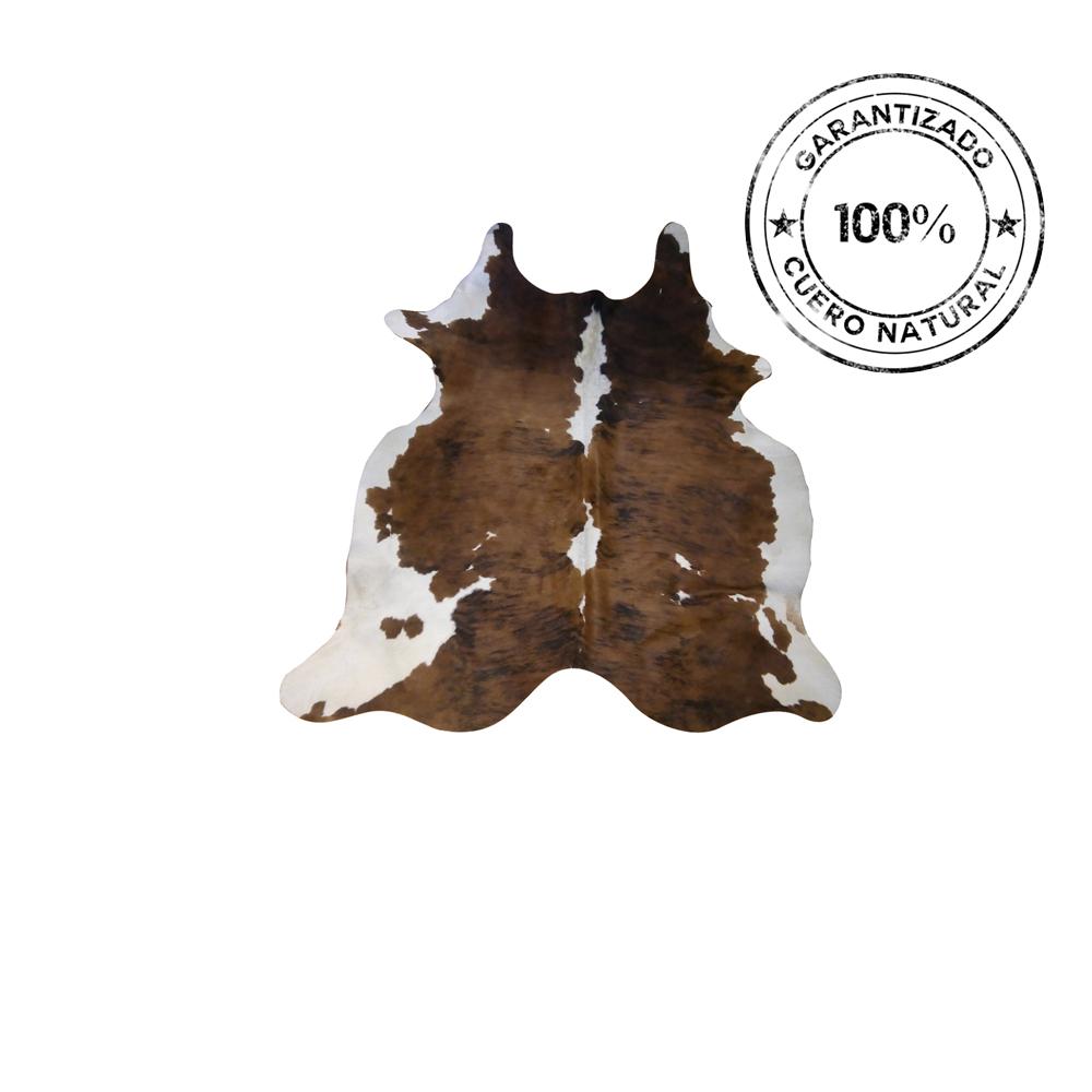Alfombra de piel con diseño natural liso de color café con manchas blancas.