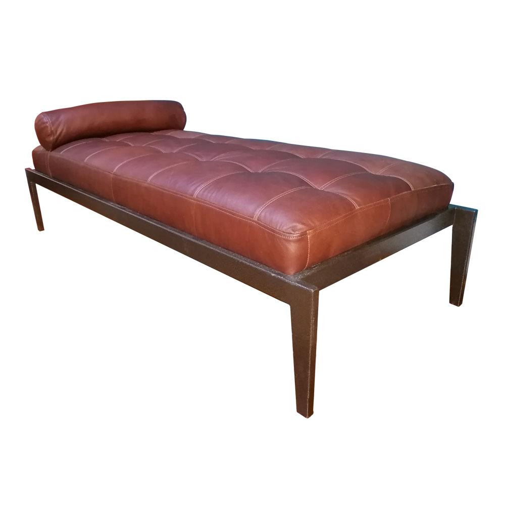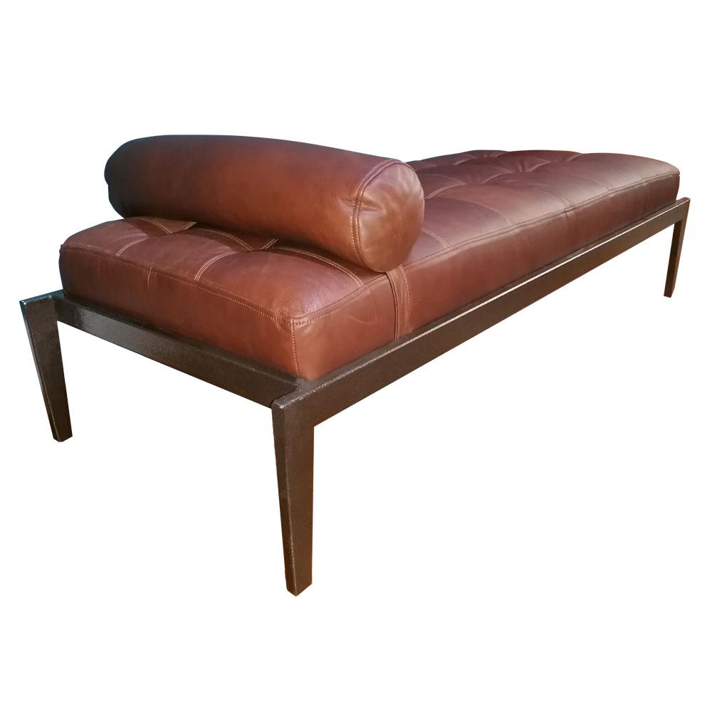 Banqueta con inspiración egipcia tapizada íntegramente en cuero con honey. Estructura de perfil de fierro.