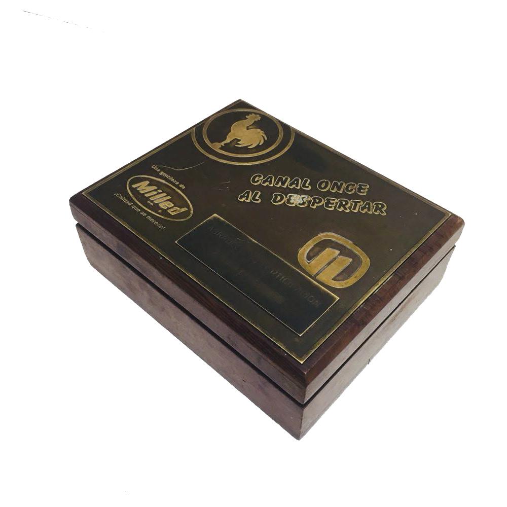 Cajita de madera alerce del aniversario de 2500 emisiones del desaparecido programa de canal 11 “Al Despertar” de los años 80 para decoración.