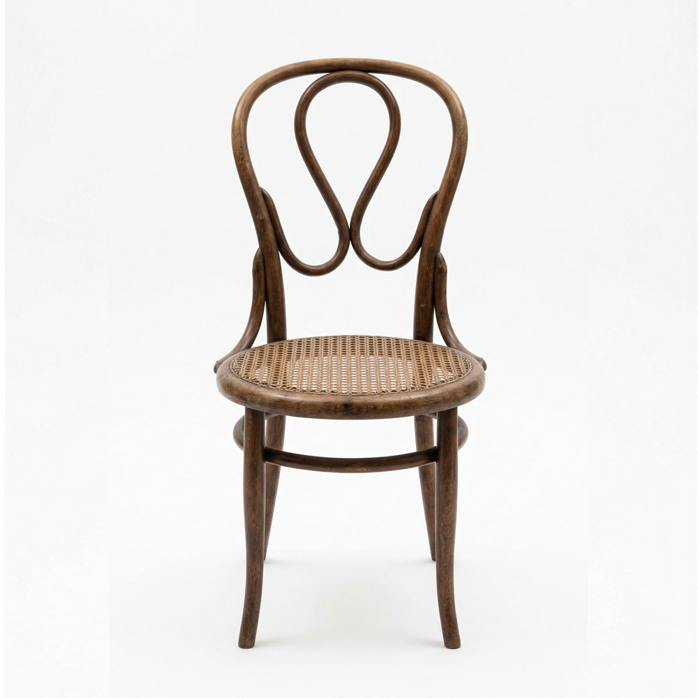 Esta es una silla clásica de madera de ratán estilo Thonet, ideal para proyectos de restauración. Presenta una estructura elegante y sinuosa, con un respaldo curvado que culmina en un círculo distintivo. El asiento está fabricado en un entramado de ratán tejido a mano, proporcionando comodidad y un toque rústico. Esta silla encarna la estética icónica del diseño Thonet y es una pieza única para los amantes del mobiliario vintage.