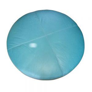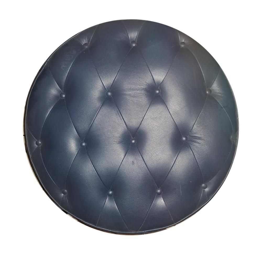 Puff de cuero con tapiz de cuero azul. Estructura de madera natural.